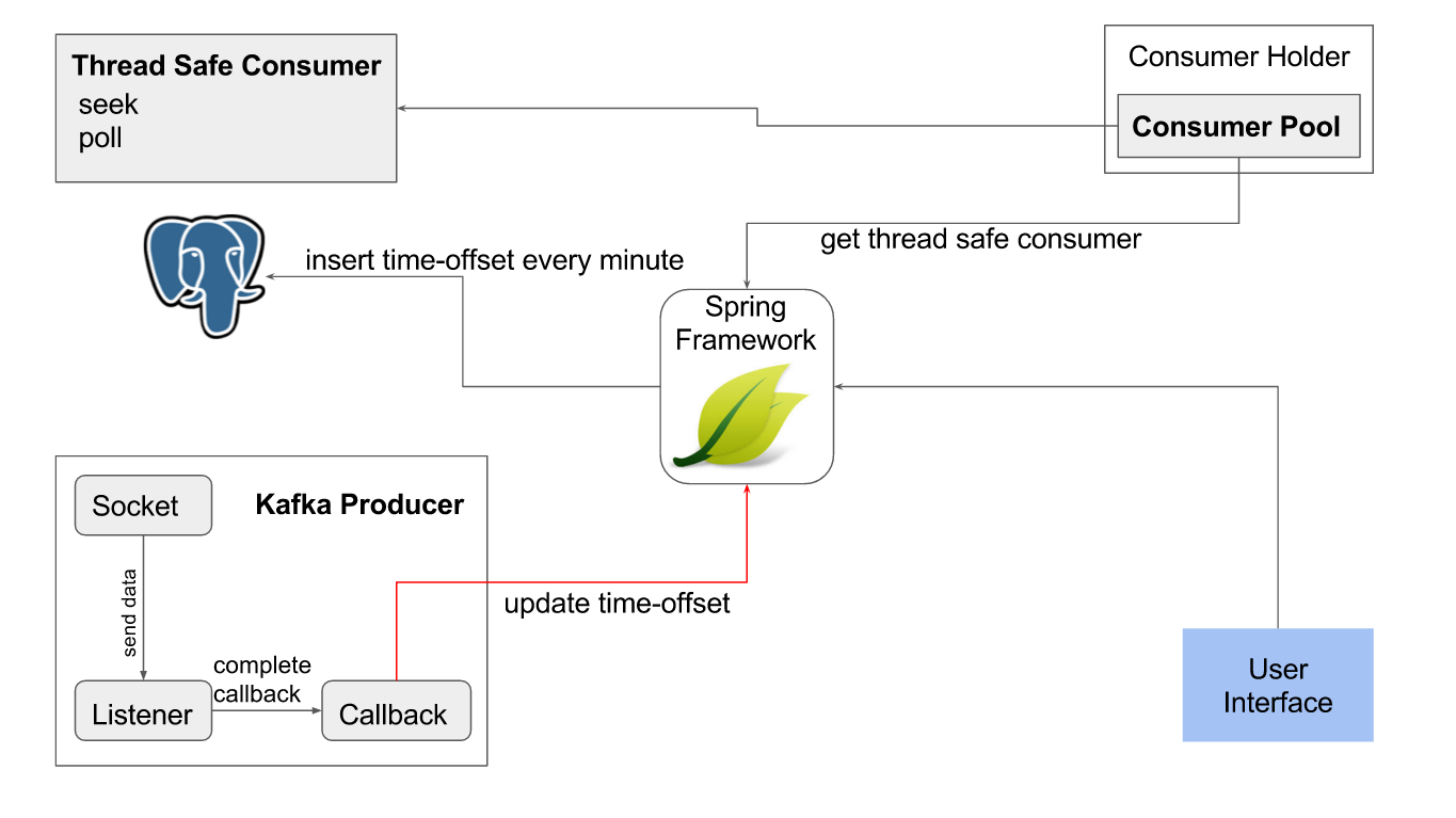 Una vez obtenido el offset para la fecha requerida se solicita por medio del "Consumer Holder" un "Thread Safe Kafka Consumer" que realiza las operaciones seek y poll, para indicar el punto y consumir a partir de él respectivamente.