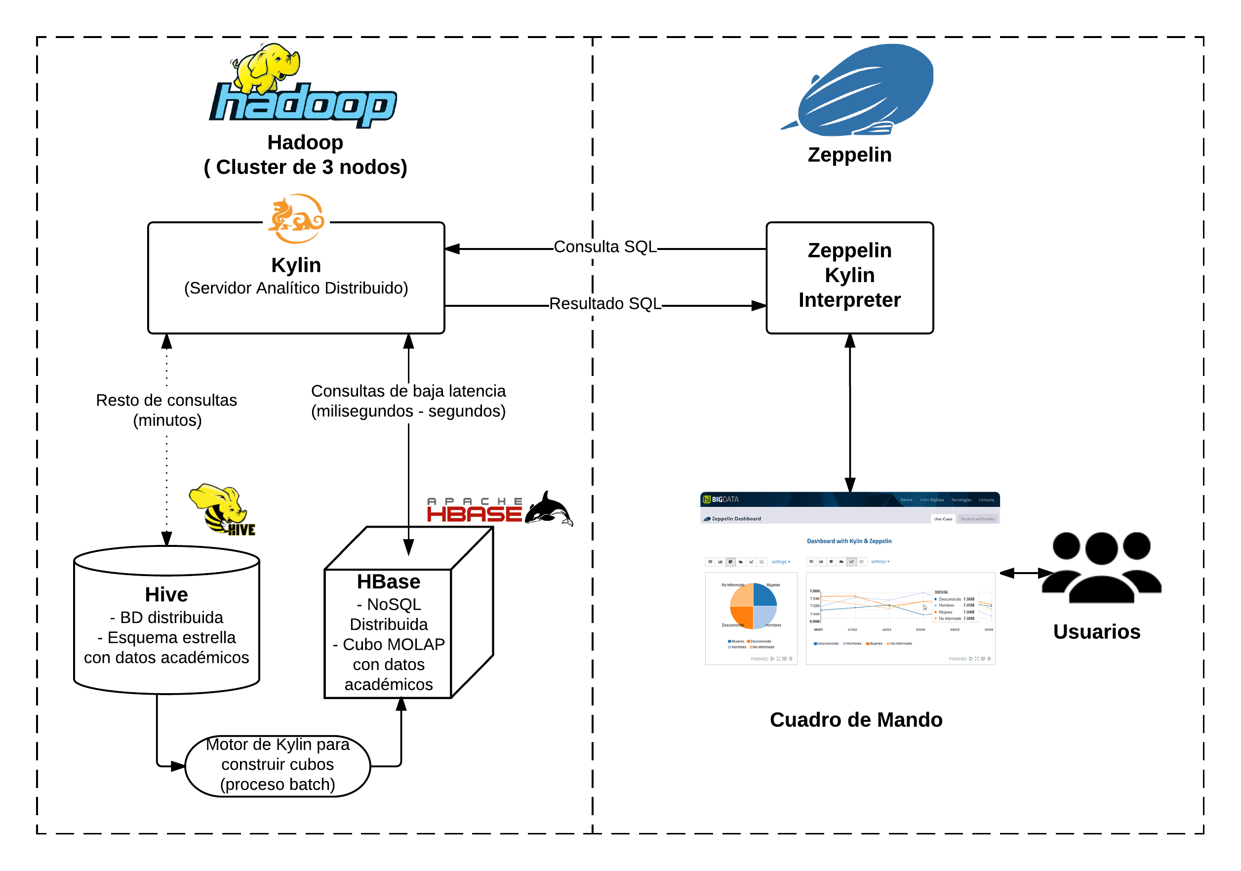 En el caso de estudio que presentamos, hacemos uso de las herramientas Apache Kylin y Zeppelin para dar soporte al análisis mediante Cuadros de Mando de un almacén de datos (Data Warehouse, DW) que contiene datos con características Big Data (Volumen, Velocidad y Variedad).